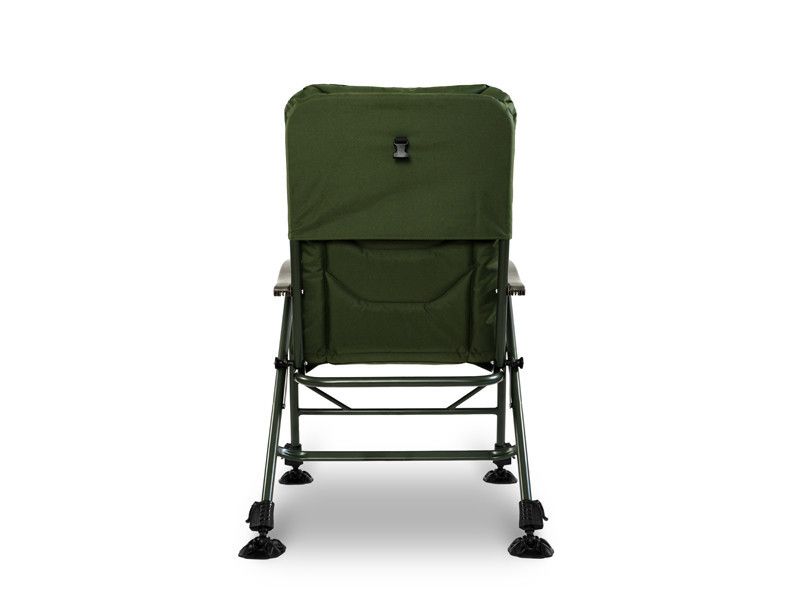 Výškovo nastaviteľné nohy umožňujú prispôsobiť kreslo nerovnému terénu a zaručujú stabilitu aj v náročných podmienkach. O bezpečné zaistenie polohy sa starajú flexibilné robustné pätky, ktorých veľká plocha účinne zabraňuje zabáraniu nôh do mäkkej pôdy pri vode. Navyše je kreslo vybavené plastovým klipom, ktorý fixuje jeho polohu počas prevozu a predchádza nechcenému roztváraniu.