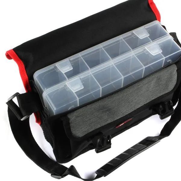S nepremokavým vrchným krytom. Najmenšia taška Reiva s vreckom na suchý zips. Vo vnútri s dvoma krabičkami na návnady.